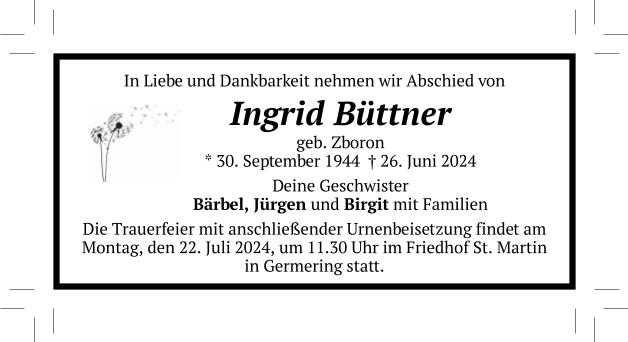 Wir trauern um Frau Ingrid Büttner geb. Zboron * 30.09.1944 † 26.06.2024 |