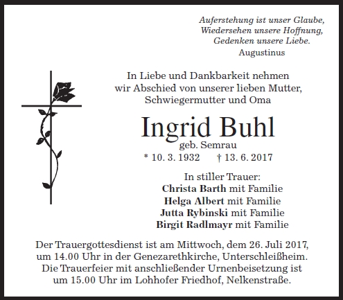 Der Trauergottesdienst ist am Mittwoch, dem 26. Juli 2017, um 14:00 Uhr in der Genezarethkirche, Unterschleißheim. |
