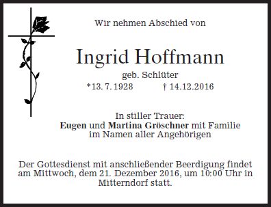 Gottesdienst mit anschließender Beerdigung am Mittwoch, dem 21. Dezember 2016, um 10:00 Uhr in Mitterndorf
