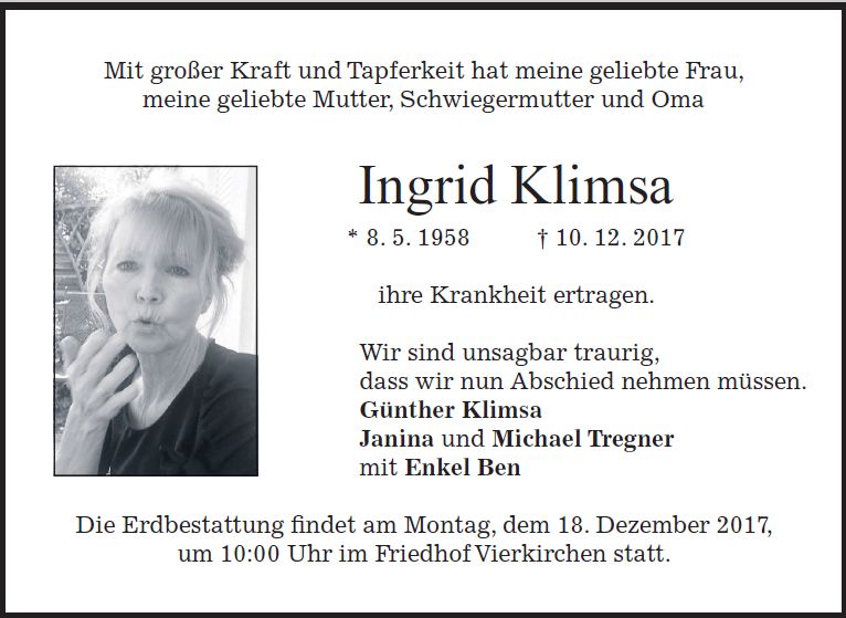 Beerdigung am Montag, dem 18. Dezember 2017, um 10:00 Uhr im Friedhof Vierkirchen.