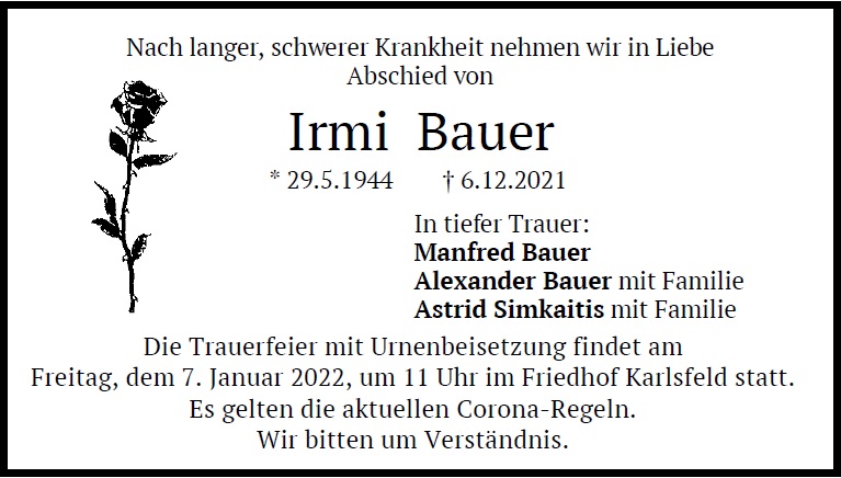 Die Trauerfeier mit anschließender Urnenbeisetzung ist am 7.1.2022 um 11 Uhr im Friedhof Karlsfeld. Es gelten die aktuellen Corona-Regeln. |
