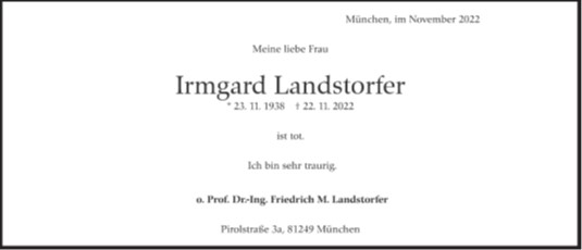 Die Trauerfeier mit anschließender Beerdigung findet am Freitag, den 2. Dezember 2022 um 09.00 Uhr im Friedhof Lochhausen, in München, statt. |