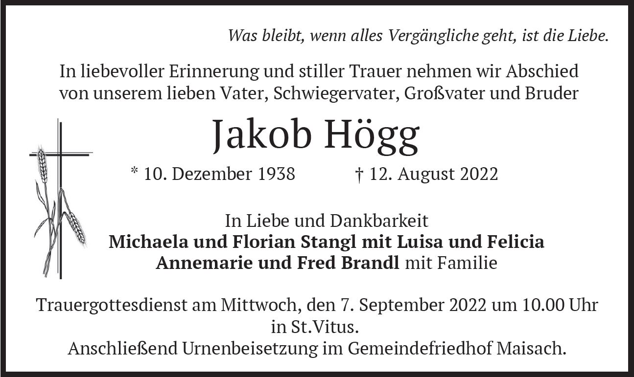 Wir trauern um Herrn Jakob Högg * 10.12.1938 † 12.08.2022 |