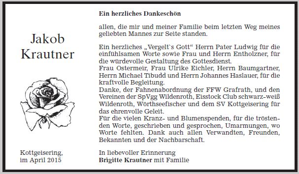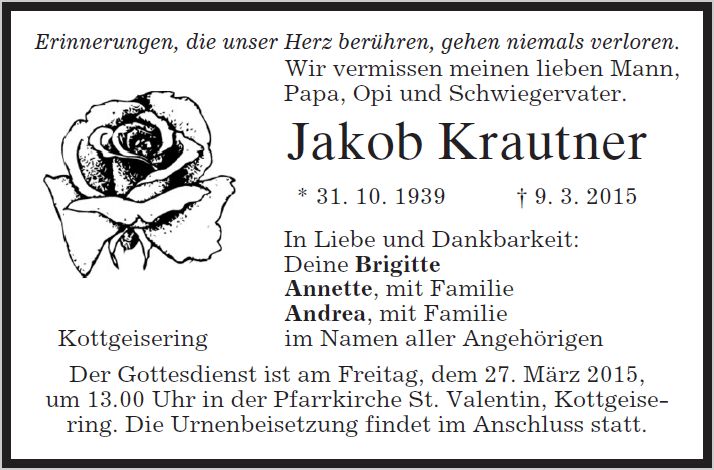 Der Gottesdienst ist am Freitag, dem 27. März 2015, um 13:00 Uhr in der Pfarrkirche St. Valentin, Kottgeisering Die Urnenbeisetzung ist am Freitag, dem 27. März 2015, im Anschluß im Friedhof in Kottgeisering