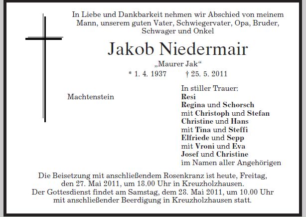 Gottesdienst mit anschließender Beerdigung am Samstag, dem 28. Mai 2011, um 10:00 Uhr in Kreuzholzhausen