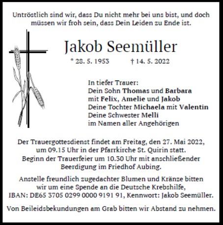 Wir trauern um Herrn Jakob Seemüller * 28.05.1953 † 14.05.2022 |