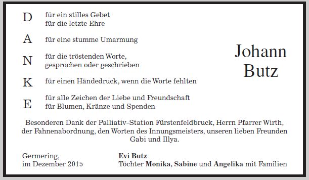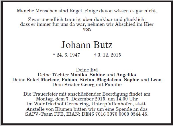 Die Trauerfeier mit anschließender Beerdigung ist am Montag, dem 7. Dezember 2015 um 14.00 Uhr, im Waldfriedhof Germering, Unterpfaffenhofen |