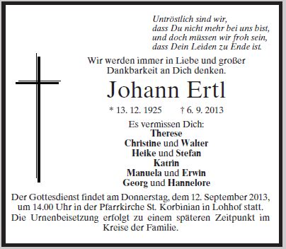 Gottesdienst am Donnerstag, dem 12. September 2013, um 14:00 Uhr in St. Korbinian