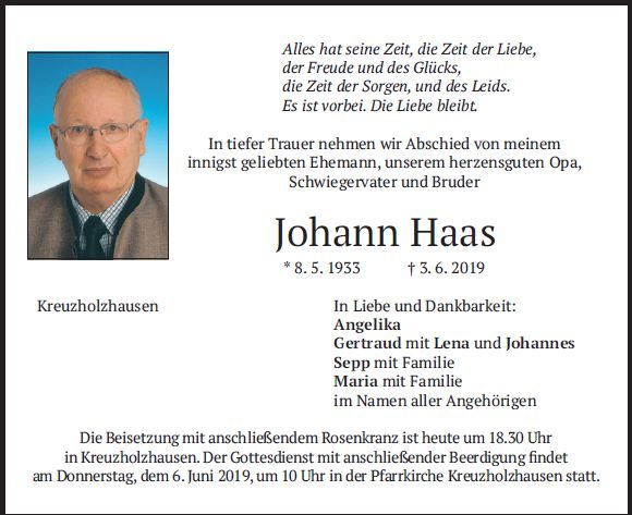 Wir trauern um Herrn Johann Haas Unternehmer * 08.05.1933 † 03.06.2019 |