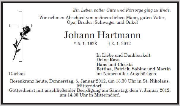 Gottesdienst am Samstag, dem 7. Januar 2012, um 14:00 Uhr in St. Nikolaus Beerdigung anschließend um 14:30 Uhr im Friedhof Mitterndorf