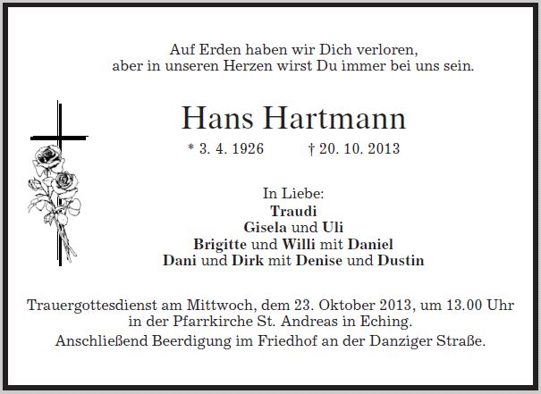 Gottesdienst am Mittwoch, dem 23. Oktober 2013, um 13:00 Uhr in der Pfarrkirche St. Andreas in Eching Beerdigung anschließend im Friedhof Eching an der Danziger Straße