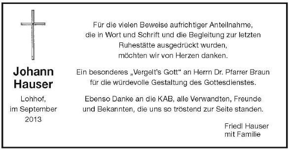 Gottesdienst am Freitag, dem 13. September 2013, um 10:00 Uhr in St. Korbinian in Lohhof Beerdigung am Freitag, dem 13. September 2013, um 10:45 Uhr im Friedhof Lohhof an der Nelkenstraße