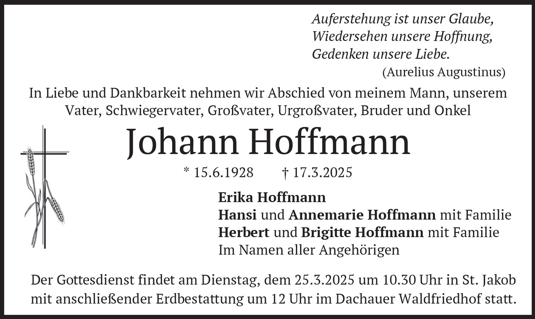 Gottesdienst am Dienstag, dem 25. März 2025, um 10:30 Uhr in St. Jakob. Beerdigung am Dienstag, dem 25. März 2025, um 12:00 Uhr im Dachauer Waldfriedhof.