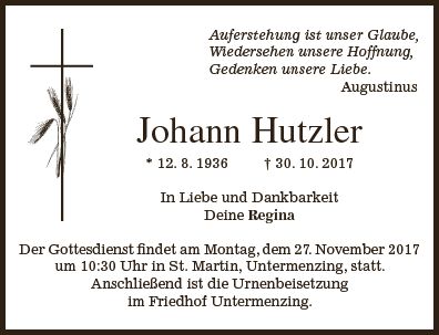 Gottesdienst am 27.11.2017 um 10:30 Uhr in St. Martin Trauerfeier mit anschließender Urnenbeisetzung am 27.11.2017 um 11:15 Uhr im Mü Untermenzing