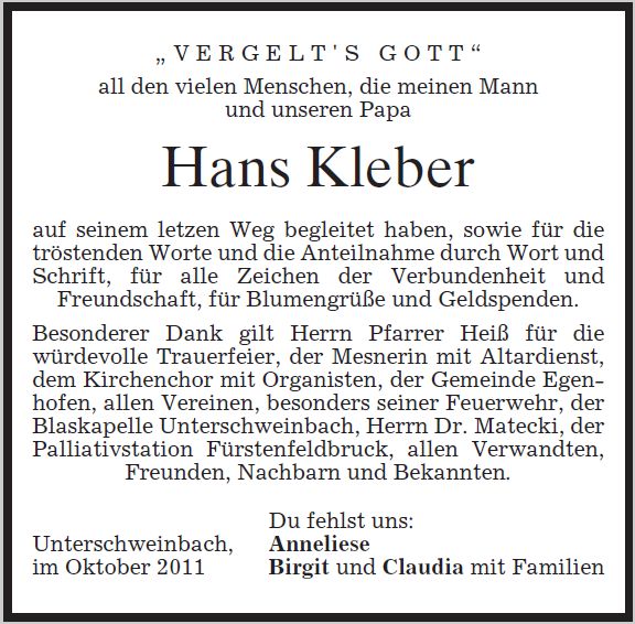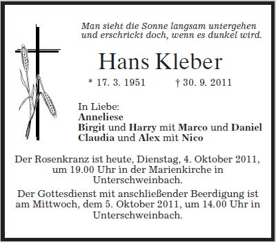 Der Gottesdienst ist am Mittwoch, dem 5. Oktober 2011, um 14:00 Uhr in der Marienkirche in Unterschweinbach mit anschließender Beerdigung.