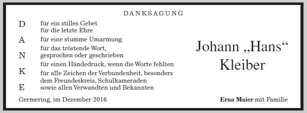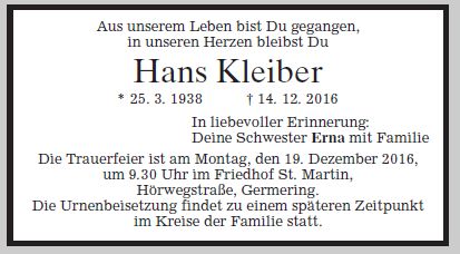 Die Trauerfeier ist am Montag, den 19. Dezember 2016 um 9.30 Uhr, im Friedhof St. Martin, Germering. Die Urnenbeisetzung findet zu einem späteren Zeitpunkt im Kreise der Familie statt.
