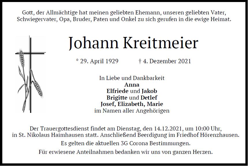 Wir trauern um Herrn Johann Kreitmeier * 29.04.1929 † 04.12.2021 |