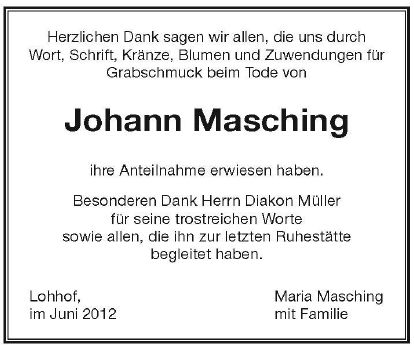 Wir trauern um Herrn Johann Masching Schlosser * 14.03.1929 † 24.05.2012 |