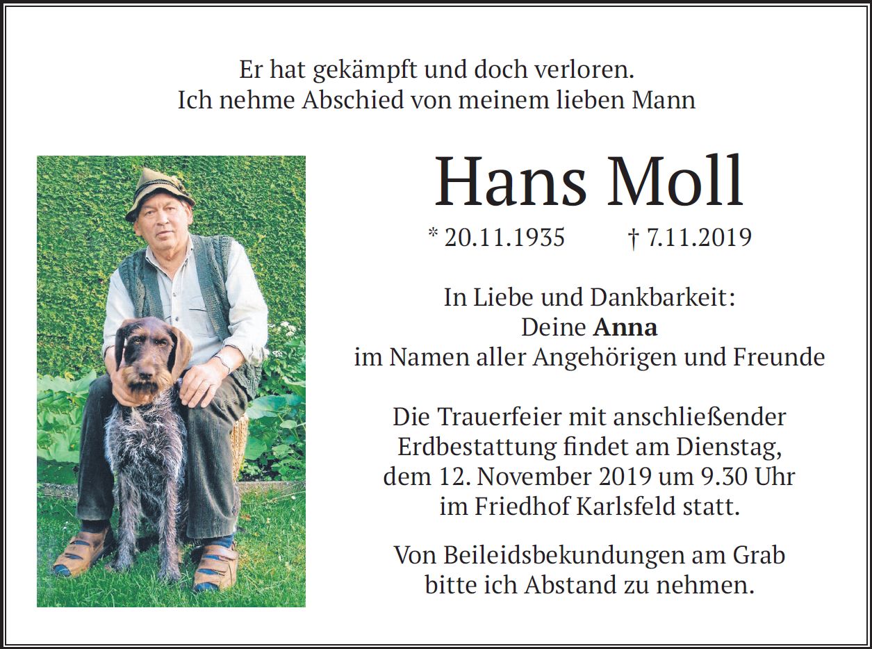 Trauerfeier mit anschließender Erdbestattung am Dienstag, dem 12. November 2019, um 09:30 Uhr im Friedhof Karlsfeld.