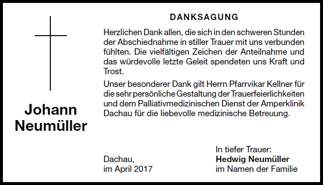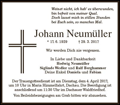 Der Gottesdienst ist am Dienstag, dem 4. April 2017, um 10 Uhr in Maria Himmelfahrt, Dachau. Die Beerdigung ist anschließend um 11:30 Uhr im Waldfriedhof Dachau.