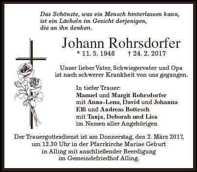 Der Gottesdienst ist am Donnerstag, den 2.3.2017 um 12.30 Uhr, Kirche Mariae Geburt, Alling. Die Beerdigung ist im Anschluß im Gemeindefriedhof Alling