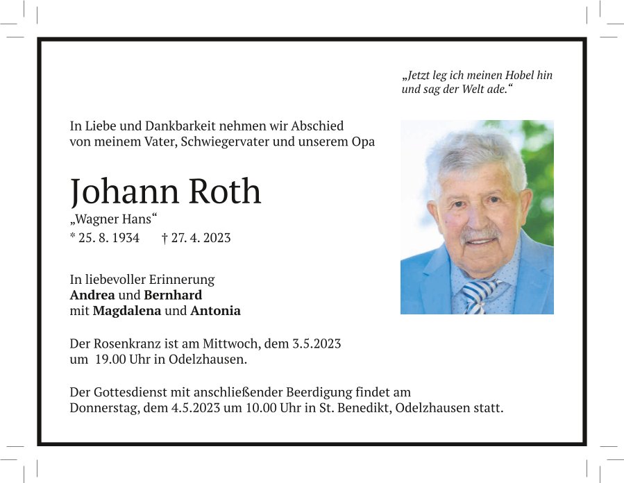 Der Gottesdienst mit anschließender Beerdigung findet am Donnerstag, dem 04. Mai, um 10:00 Uhr in St. Benedikt in Odelzhausen statt.