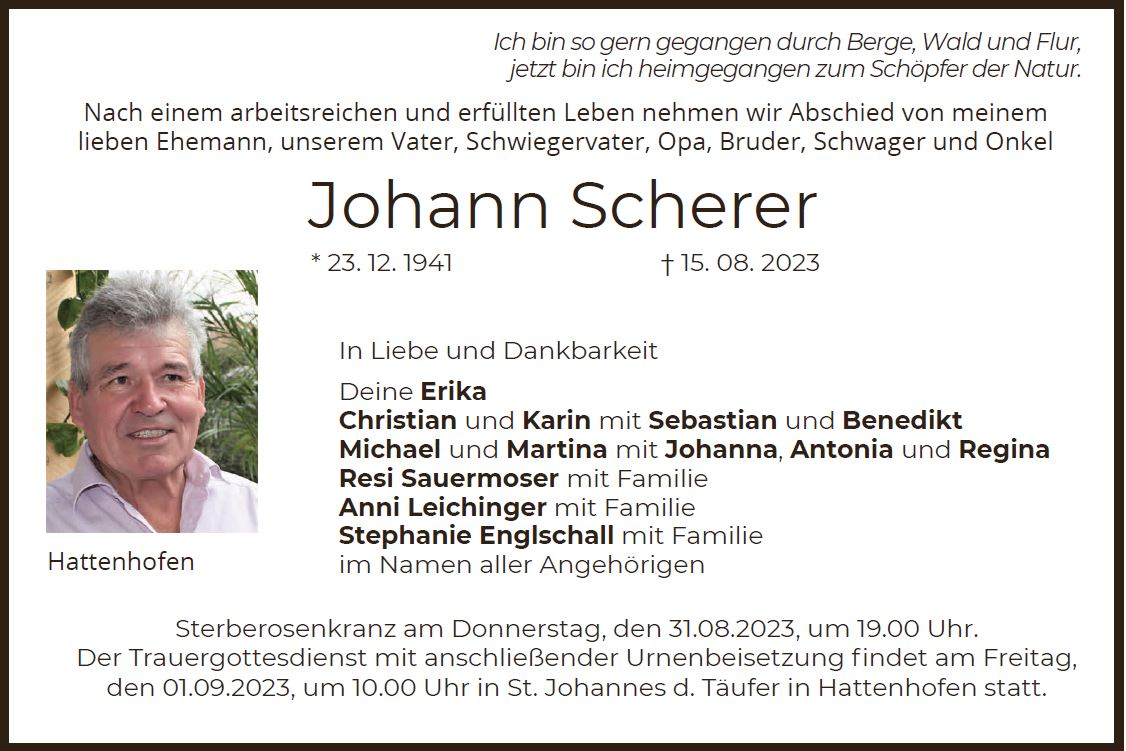 Wir trauern um Herrn Johann Scherer * 23.12.1941 † 15.08.2023 |