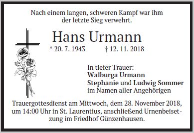 Wir trauern um Herrn Johann Urmann Technischer Angestellter * 20.07.1943 † 12.11.2018 |