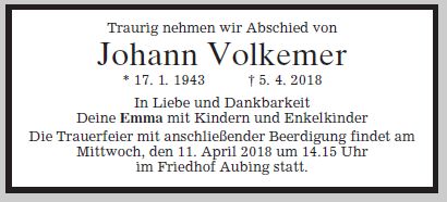 Die Trauerfeier mit anschließender Beerdigung findet am Mittwoch, dem 11. April 2018, um 14:15 Uhr, im Friedhof München Aubing statt. |