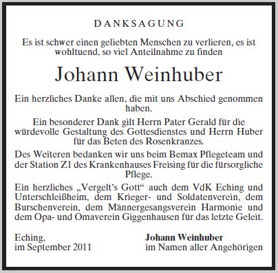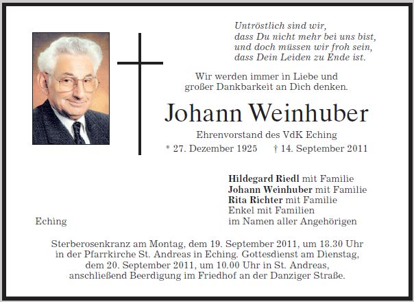 Wir trauern um Herrn Johann Weinhuber Feinmechaniker * 27.12.1925 † 14.09.2011 |