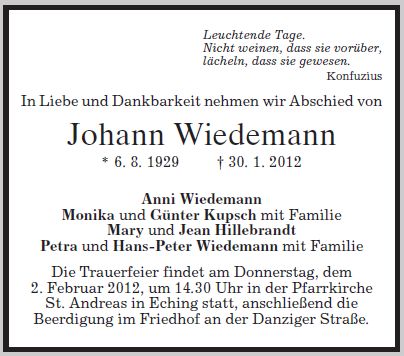 Trauerfeier mit anschließender Beerdigung am Donnerstag, dem 2. Februar 2012, um 14:30 Uhr in St. Andreas - Neu, in Eching |