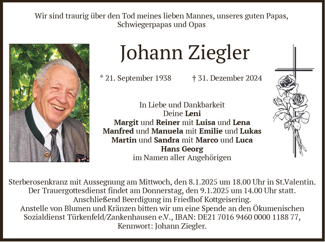 Wir trauern um Herrn Johann Ziegler * 21.09.1938 † 31.12.2024 |