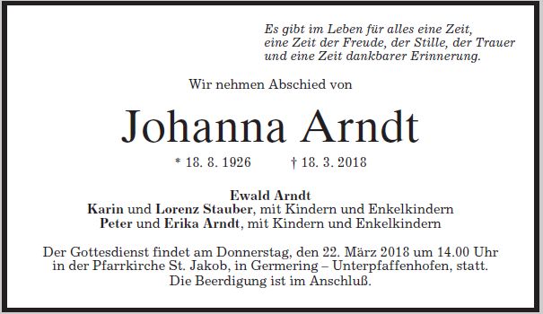 Wir trauern um Frau Johanna Arndt geb. Hierl Hausfrau * 18.08.1926 † 18.03.2018 |