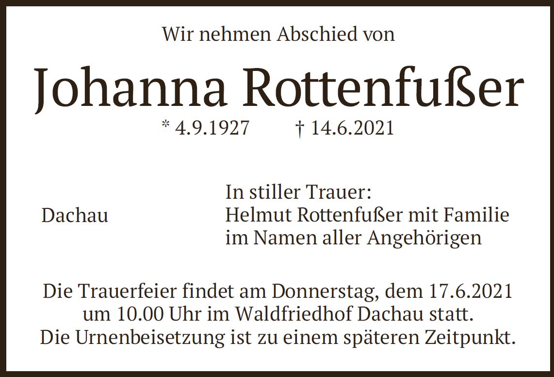 Trauerfeier am Donnerstag, dem 17. Juni 2021, um 10:00 Uhr im Dachauer Waldfriedhof.