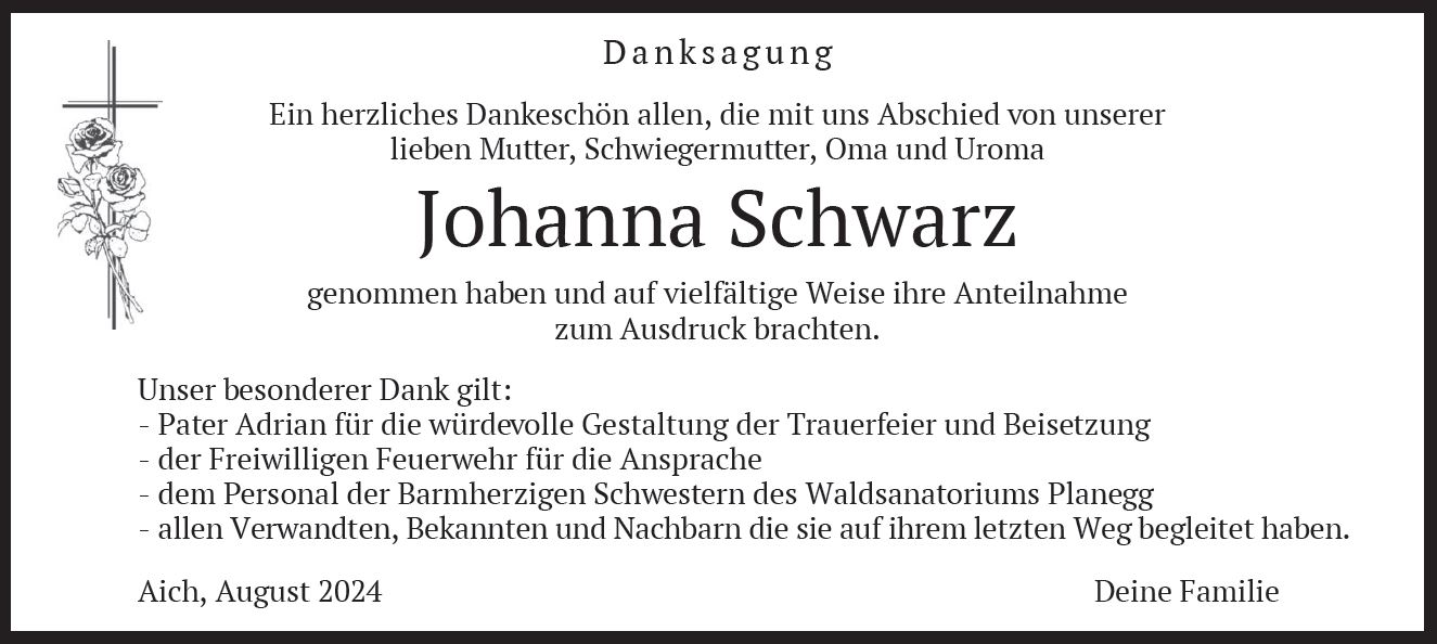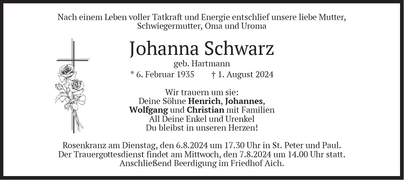Wir trauern um Frau Johanna Schwarz geb. Hartmann * 06.02.1935 † 01.08.2024 |