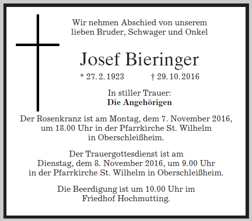 Wir trauern um Herrn Josef Bieringer Elektriker * 27.02.1923 † 30.10.2016 |