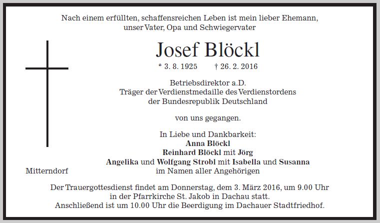 Wir trauern um Herrn Josef Blöckl Betriebsdirektor a.D. und Träger der Verdienstmedaille des Verdienstordens der Bundesrepublik Deutschland * 03.08.1925 † 26.02.2016 |