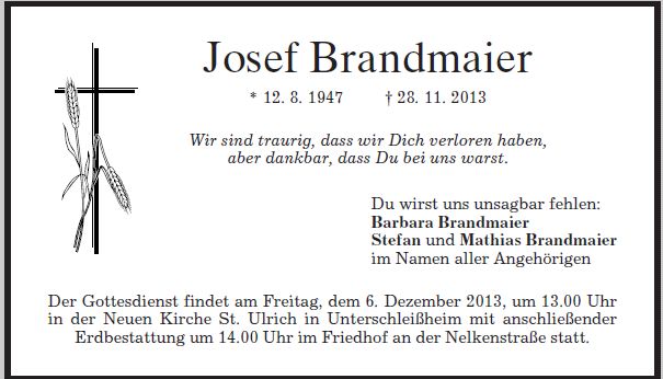 Gottesdienst am Freitag, dem 6. Dezember 2013, um 13:00 Uhr in St. Ulrich (Neue Kirche) Beerdigung am Freitag, dem 6. Dezember 2013, um 14:00 Uhr im Friedhof Lohhof an der Nelkenstraße.