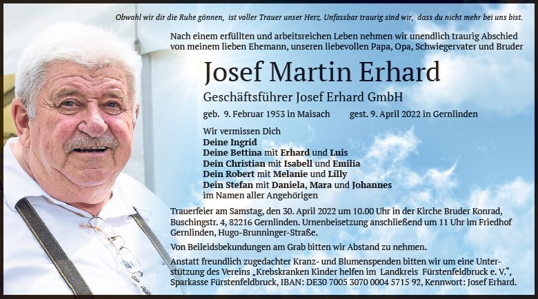 Gottesdienst am Samstag, dem 30. April 2022, um 10:00 Uhr, Kirche Bruder Konrad, Gernlinden anschließend die Urnenbeisetzung, Friedhof Gernlinden