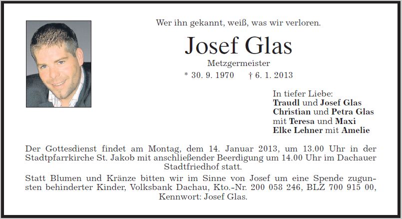 Hab es eben erst erfahren.... Unfassbar....liebe Familie Glas, viel zu früh ist Josef gegangen. Ihnen viel Kraft. |