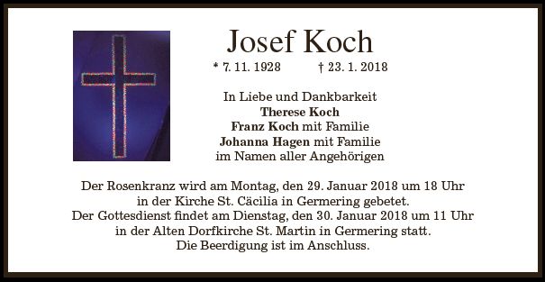 Wir trauern um Herrn Josef Koch Oberamtsrat * 07.11.1928 † 23.01.2018 |