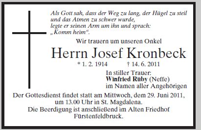 Der Gottesdienst findet statt am Mittwoch, dem 29.6.2011 um 13:30 Uhr in St. Magdalena. Die Beerdigung ist anschließend im alten Friedhof Fürstenfeldbruck, Kirchstraße 13.