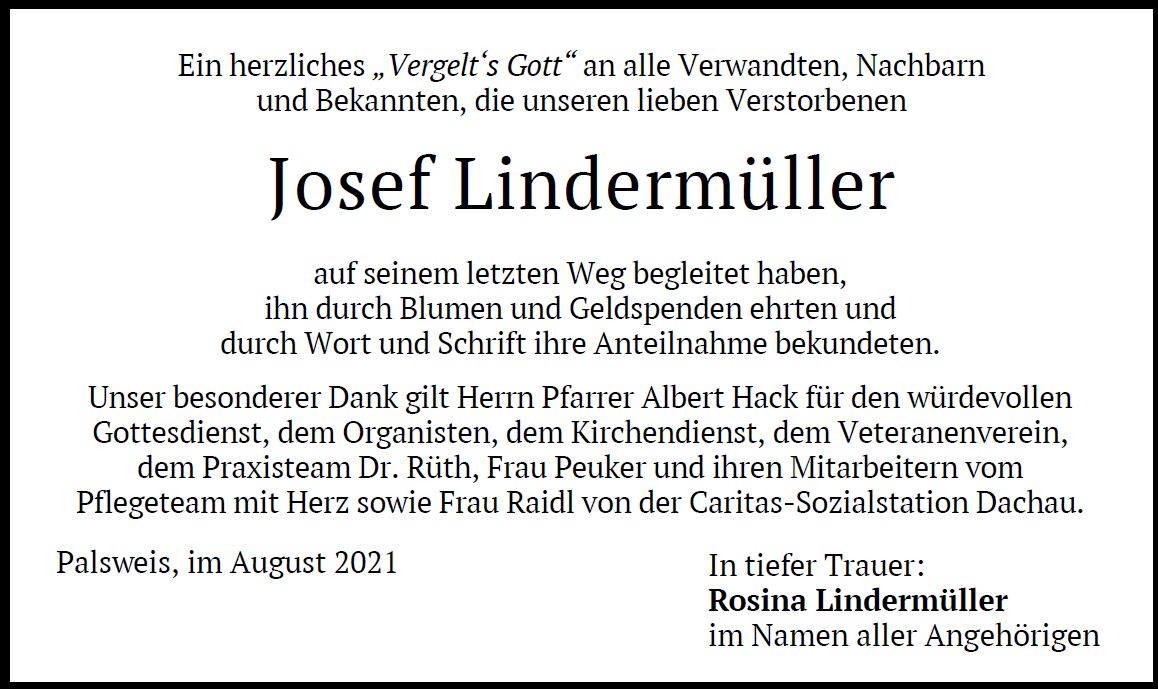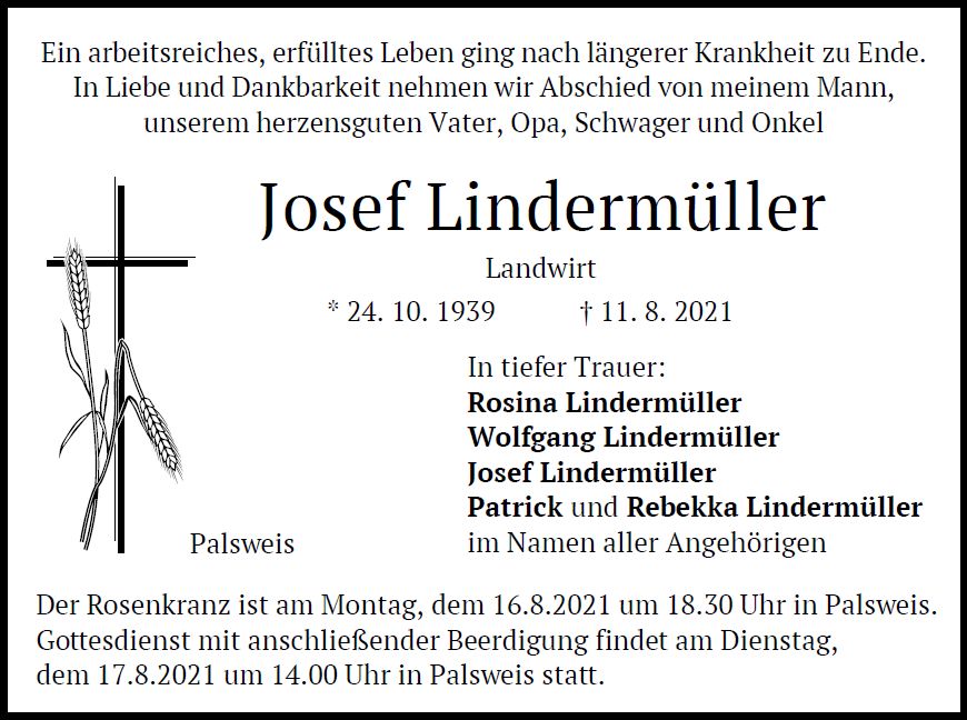 Gottesdienst am Dienstag, dem 17. August 2021, um 14:00 Uhr in St. Urban, Palsweis mit anschließender Beerdigung.
