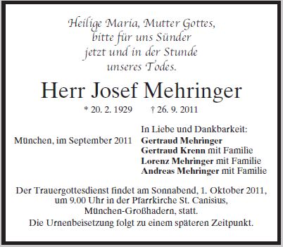 Gottesdienst am Samstag, dem 1. Oktober 2011, um 09:00 Uhr in St. Canisius Beisetzung zu einem späteren Zeitpunkt im Waldfriedhof Alter Teil in München
