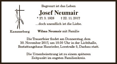 Die Trauerfeier ist am Donnerstag, dem 30. November 2017, um 10:30 Uhr, Lichthalle, Hanrieder Bestattungshaus, Loestrasse 5, 85221 Dachau. |