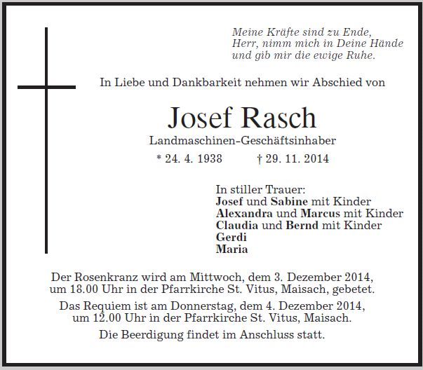 Gottesdienst am Donnerstag, dem 4. Dezember 2014, um 12:00 Uhr in St. Vitus, Maisach Beerdigung am Donnerstag, dem 4. Dezember 2014, um 12:45 Uhr im Maisach