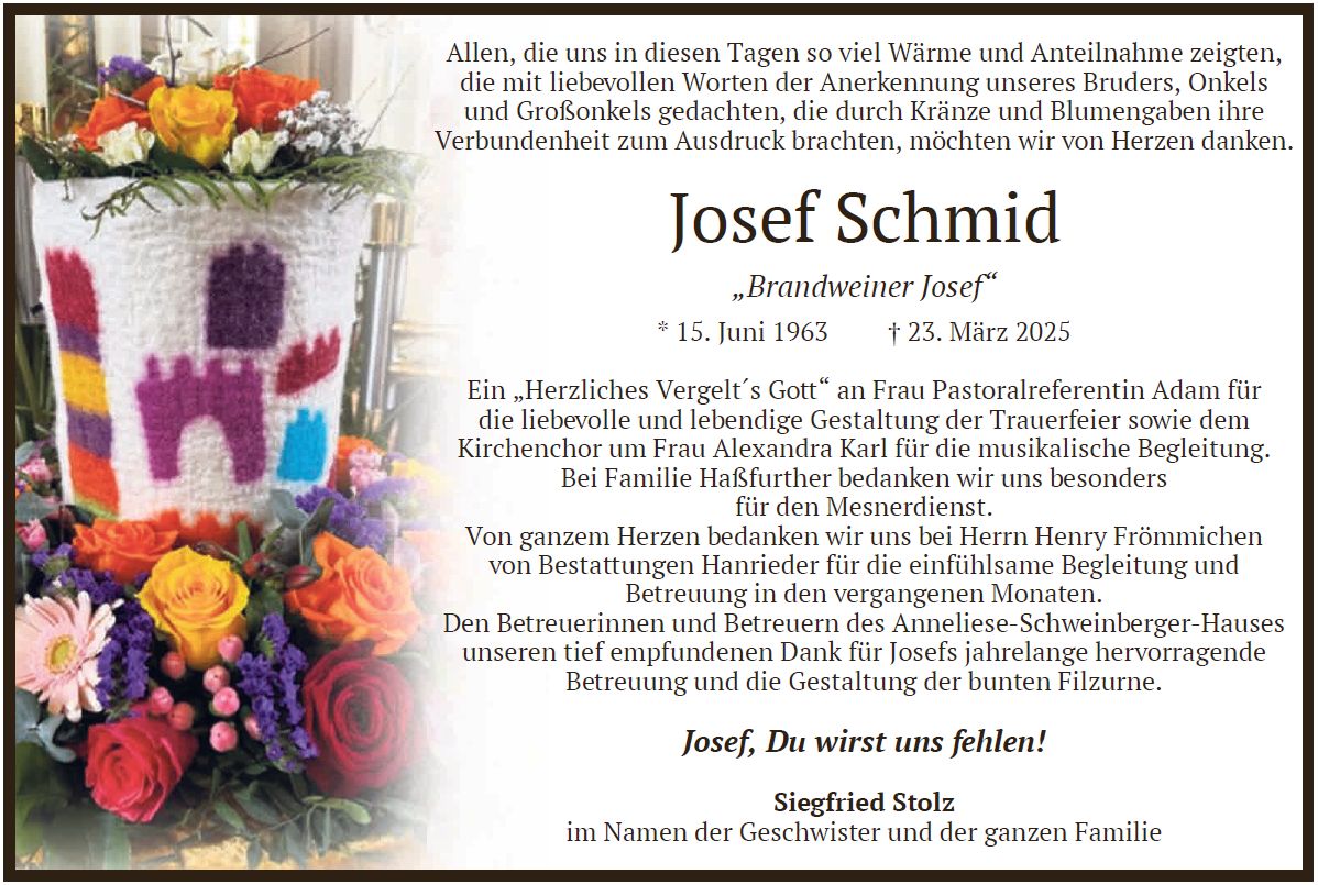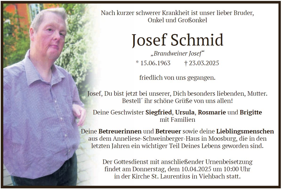 Der Gottesdienst ist am Donnerstag, dem 10. April 2025, um 10:00 Uhr in St. Laurentius, Viehbach. Die Urnenbeisetzung findet im Anschluss statt.