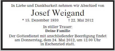 Gottesdienst mit anschließender Beerdigung am Donnerstag, dem 24. Mai 2012, um 12:00 Uhr in Eschenried.