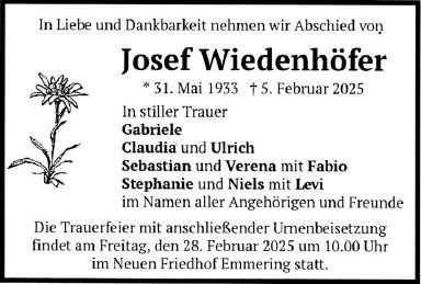 Die Trauerfeier mit anschließender Urnenbeisetzung findet am Freitag, den 28.Februar 2025 um 10:00 Uhr im Neuen Friedhof Emmering statt. |