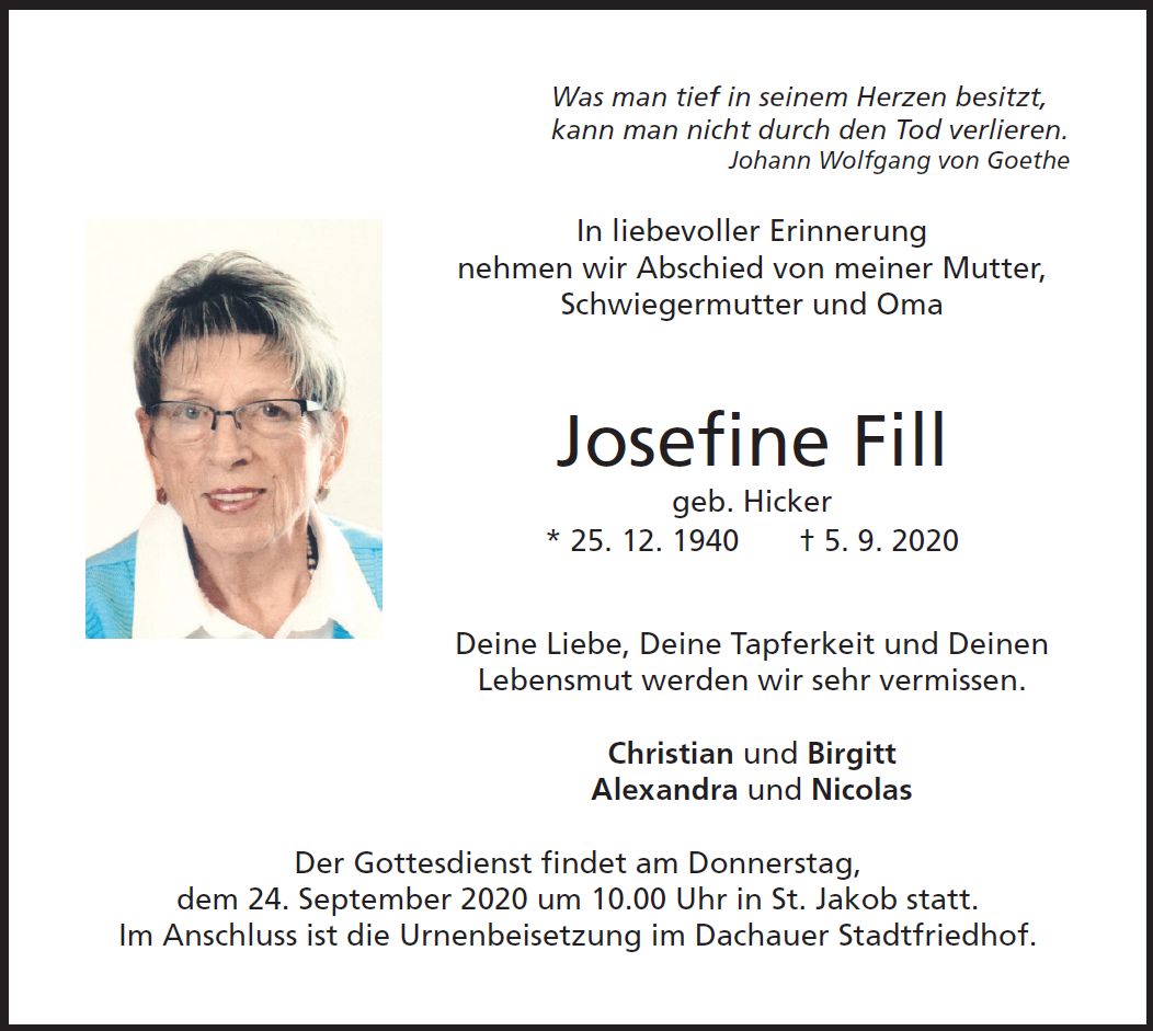 Gottesdienst am 24.09.2020 um 10:00 Uhr in St. Jakob. Beisetzung am 24.09.2020 um 11:00 Uhr im Dachauer Stadtfriedhof.